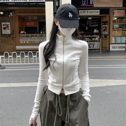 سترة تنحيف الخصر بسحاب مزدوج وأكمام طويلة كاجوال على شكل هيكل السمكة