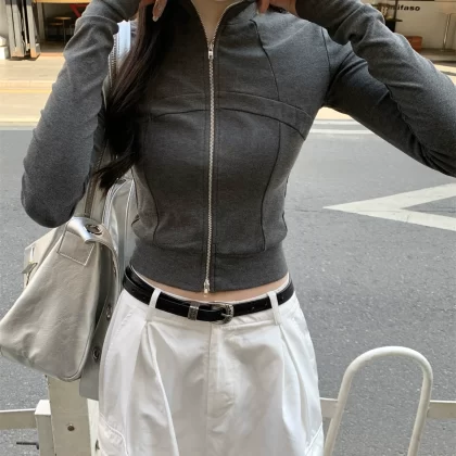 Waist slimming double zipper long sleeve casual jacket fishbone