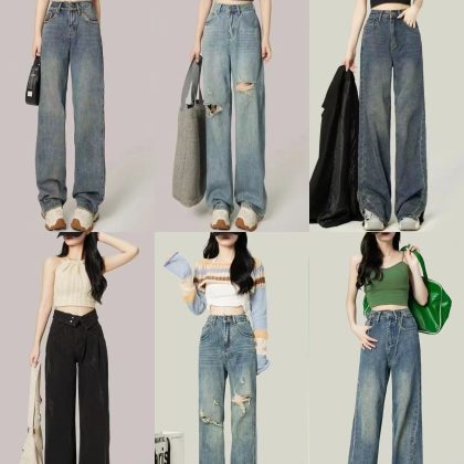 Wanjia ثلاثة عشر خط خصم العلامة التجارية واسعة الساق الجينز النسائية 2023 متجر لايف العرض الأساسي السلع النهائية بالجملة