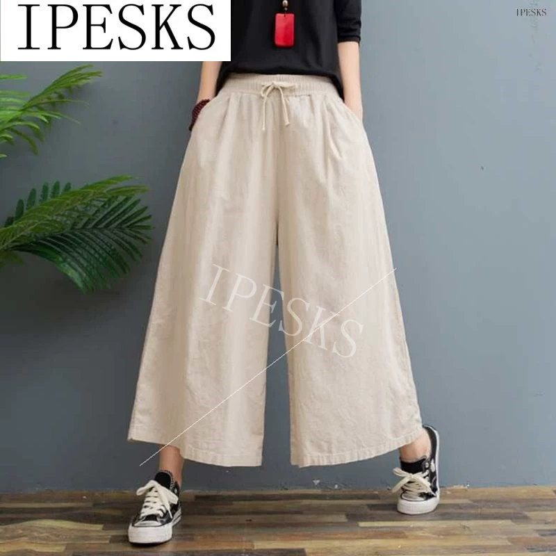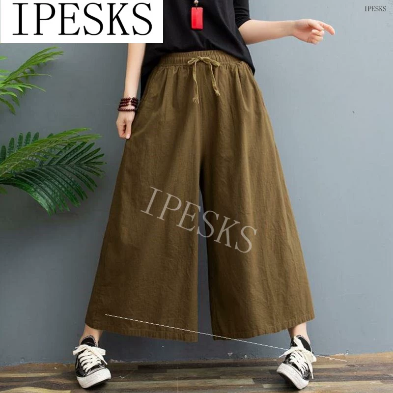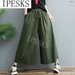 بنطلون واسع الساق من القطن والكتان قابل للغسل للنساء رفيع وكبير
