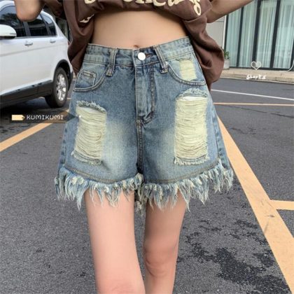 شورت جينز نسائي عتيق مغسول بتصميم Sense Niche ذو حافة ممزقة 2024 سروال صيفي ساخن