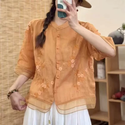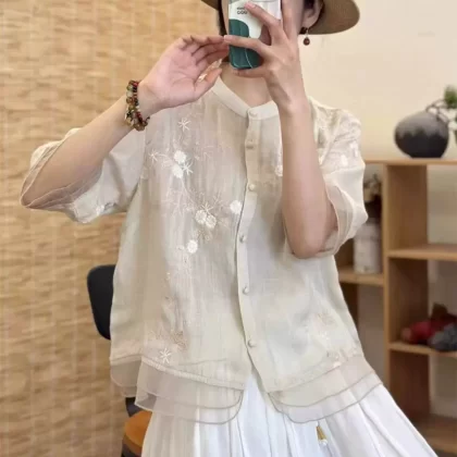 قميص قابل للذوبان في الماء مع تطريز فني من الأورجانزا على الطراز الصيني