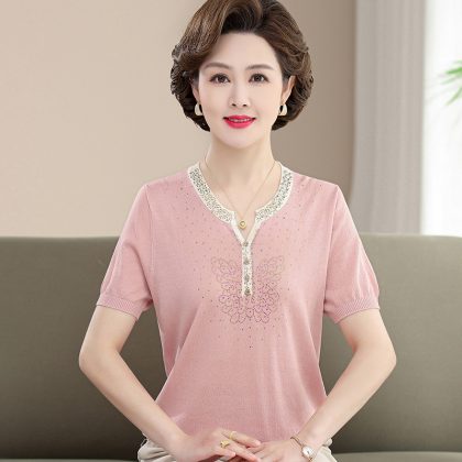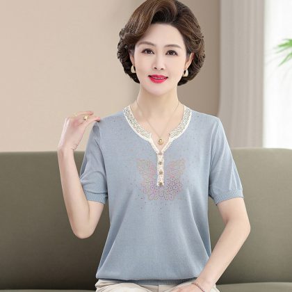 Western style middle-aged and elderly mothers contrast color casual thin summer new comfortable T-shirt knitted short sleeve 2024 loose shirt