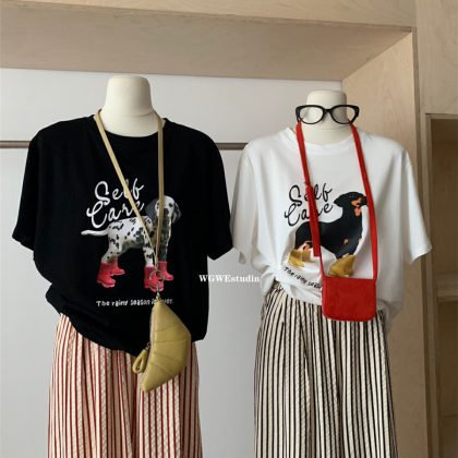 WGWE lazy style dog print short-sleeved women's summer loose and slim new t-shirt mid-length half-sleeved top