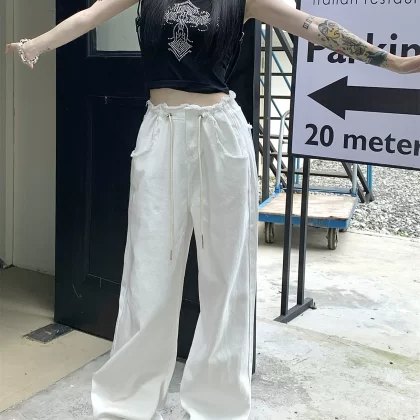 | nameOriginal | White elastic waist raw edge wide leg straight trousers with drawstring |