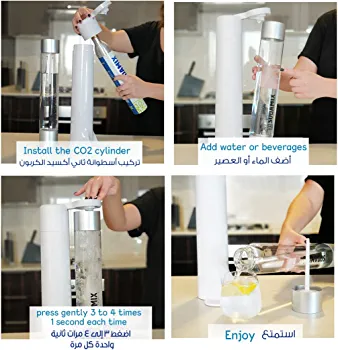 صانعة الصودا المحمولة White Family Pack Sodamix مع زجاجتين من الكربونات الخالية من BPA واسطوانتين كاملتين من الألومنيوم CO2. يقوم بالكربونات بجميع أنواع المشروبات، دون الحاجة إلى بطارية.