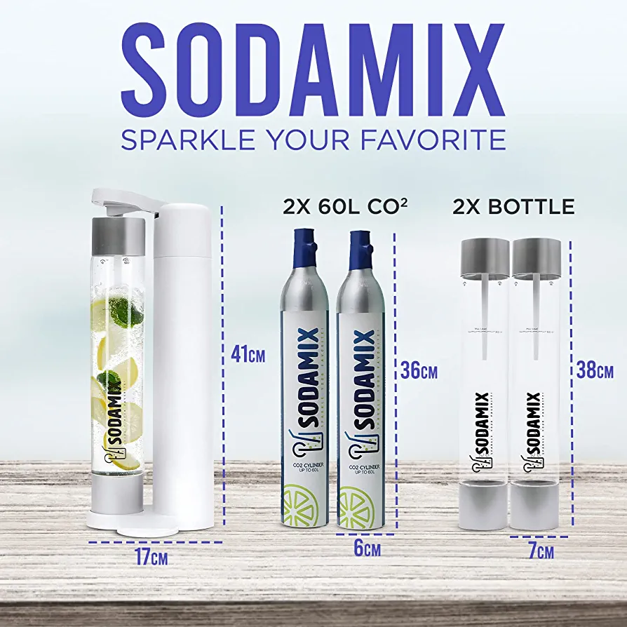 Sodamix Sparkling Water Maker Family Package, Carbonates All Kinds of Beverages, No Battery, Portable Soda Maker, 2 BPA-FREE Carbonation Bottles, 2 Full CO2 Aluminum Cylinders. (White Family Pack)