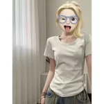 | nameOriginal | White gray short-sleeved right shoulder T-shirt for women summer short pure cotton T-shirt slimming Hong Kong style retro chic top |