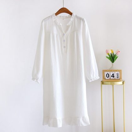 ثوب النوم الأبيض كريب القطن فستان الربيع والخريف بأكمام طويلة المرأة فضفاضة منتصف طول فستان القطن الأميرة فستان ملابس المنزل
