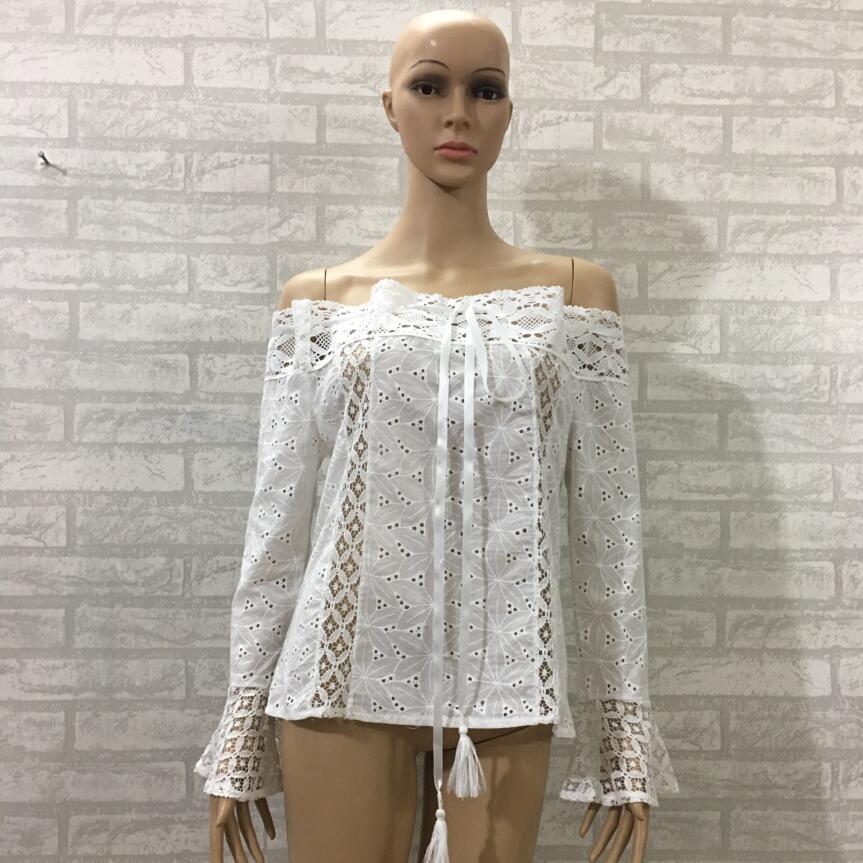 White off-shoulder bell sleeve lace top off-shoulder tassel lace stitching top in stock