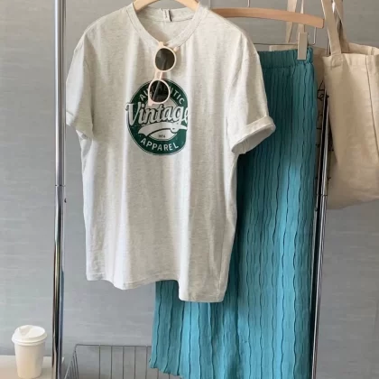 أبيض ريترو أخضر تي شيرت مطبوع المرأة قصيرة الأكمام 2022 محطة أوروبية جديدة فضفاضة السلع الأوروبية نسخة كبيرة علوية