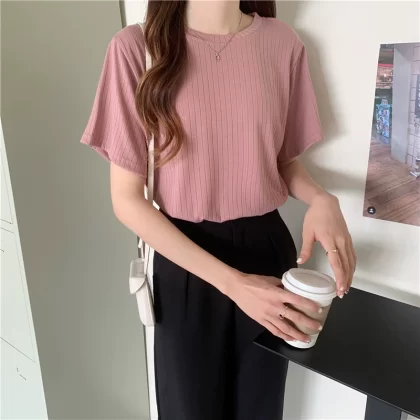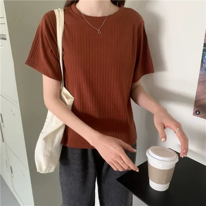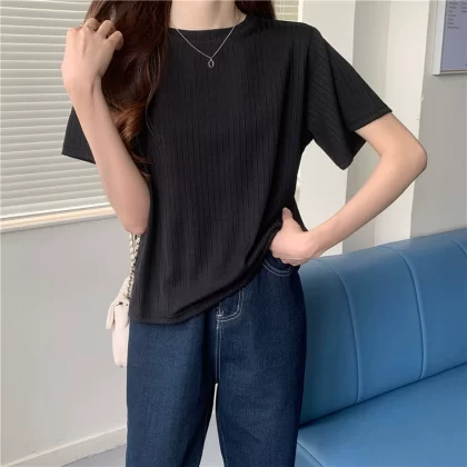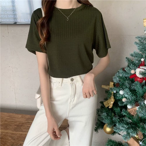 تي شيرت أبيض بكتف يمين وجزء علوي داخلي محبوك وأكمام قصيرة