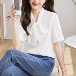 قميص نسائي بشريط من الساتان الأبيض بأكمام قصيرة بتصميم صيفي مناسب لأسلوب هونغ كونغ ركاب احترافي يناسب الجميع برباط