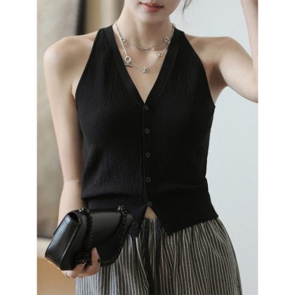 wine red Camisole Women's 2024 Summer New V-neck Slim-fit Short Hanging Neck Knitted Outer Wear Sleeveless Top