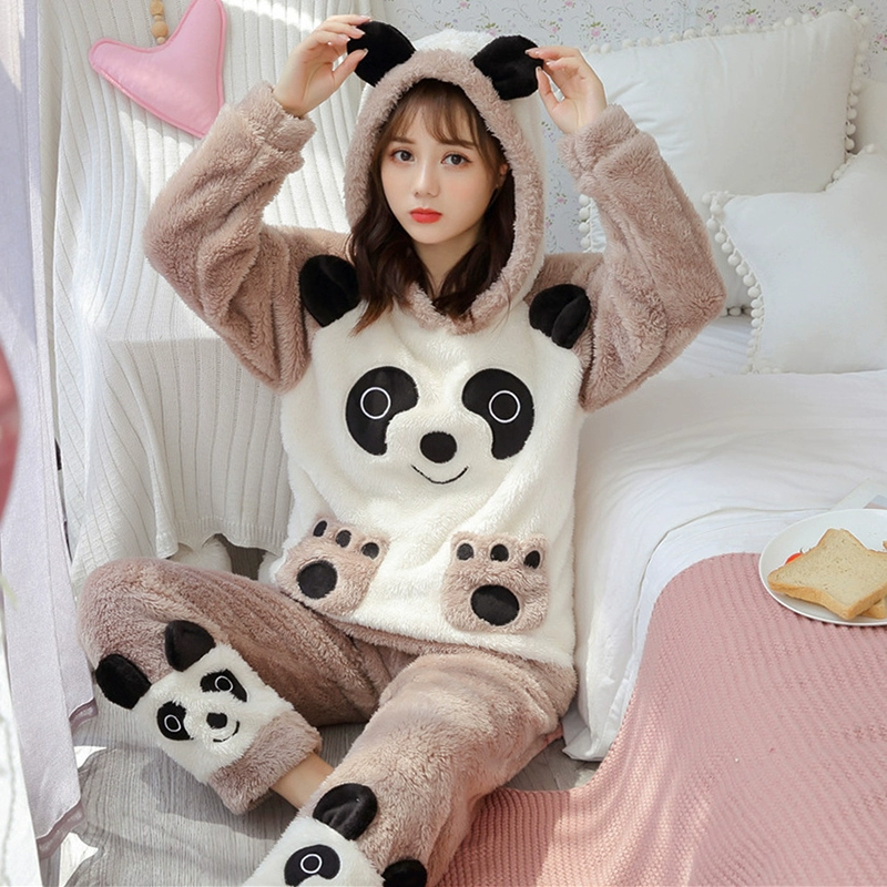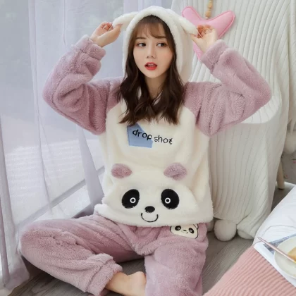 بيجامة شتوية مخملية سميكة من المخمل المرجاني للنساء بقلنسوة طويلة الأذن على شكل أرنب مجموعة ملابس منزلية للطلاب دافئة ولطيفة