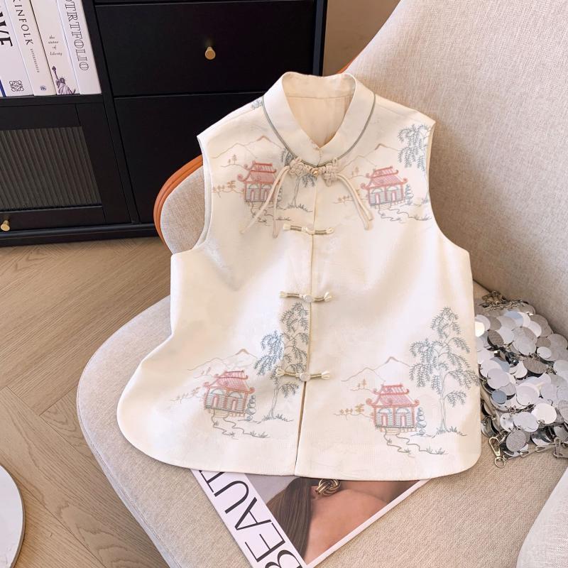 Women's 2024 New Spring and Autumn Women's Clothing National Style New Chinese Style Vest Printed Coat Shirt Stacked Waistcoat Pony Clip