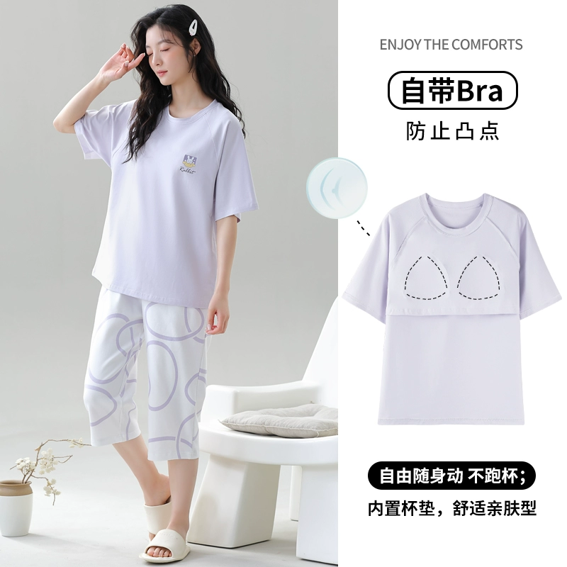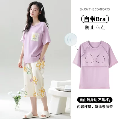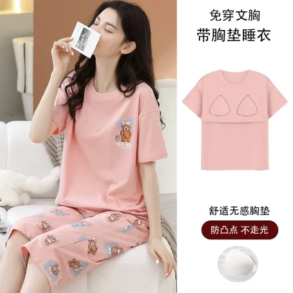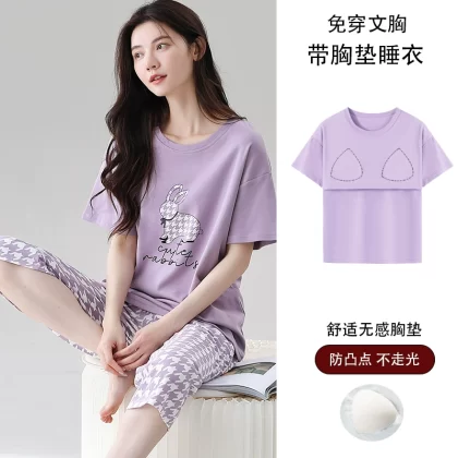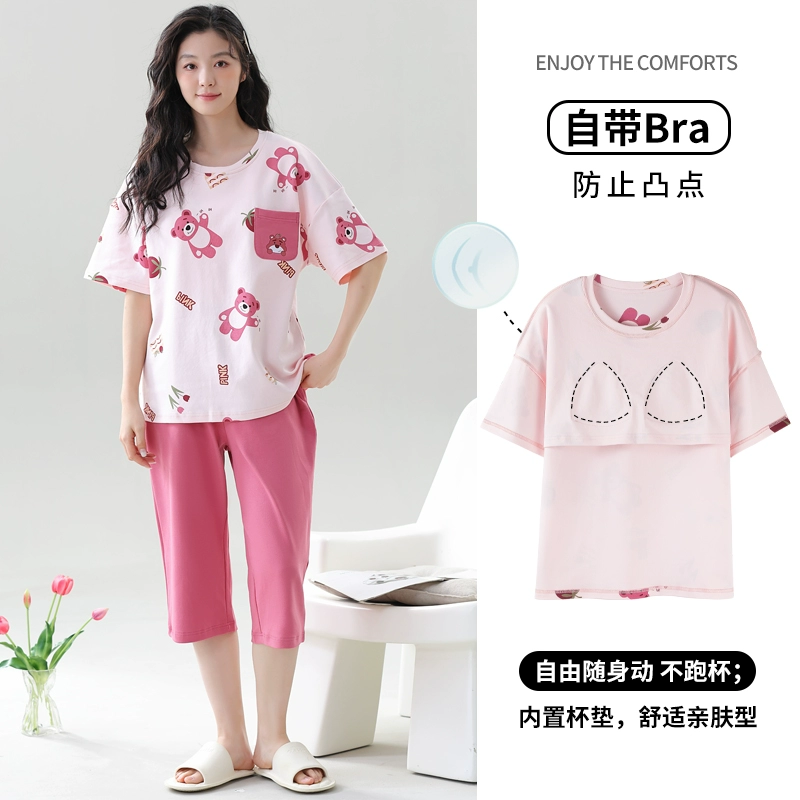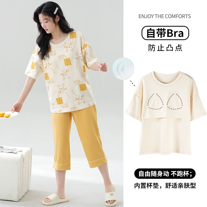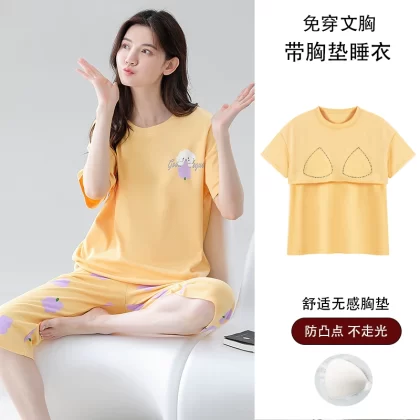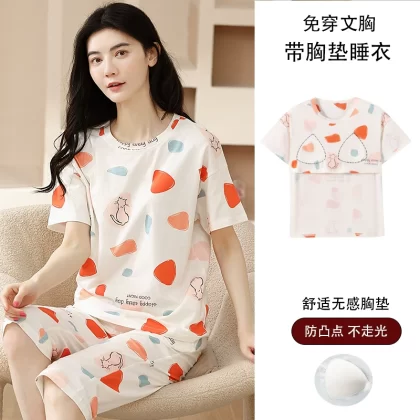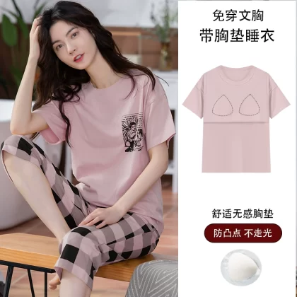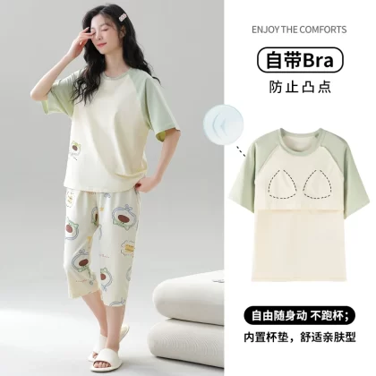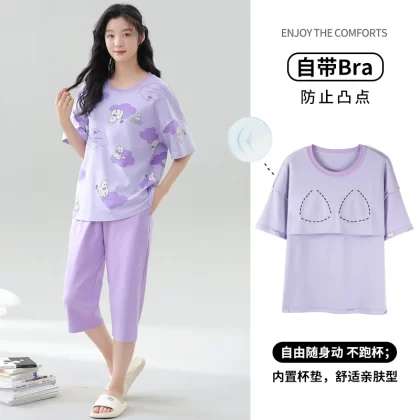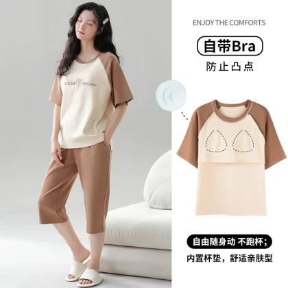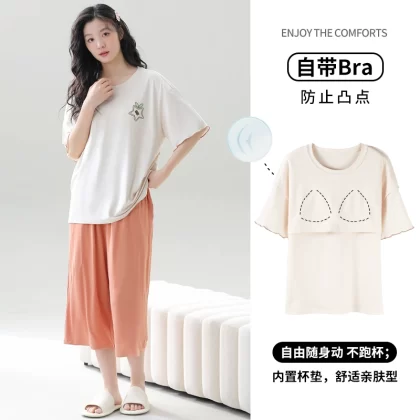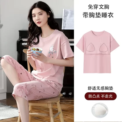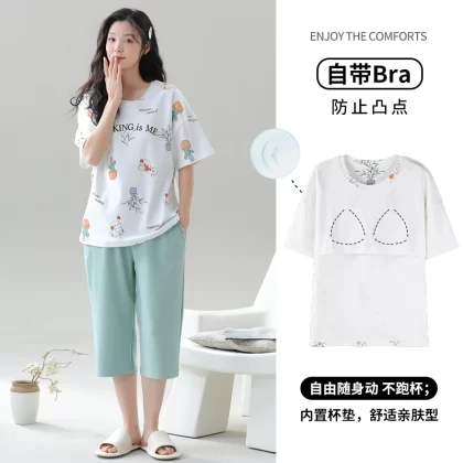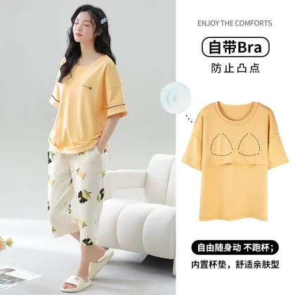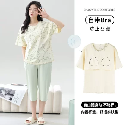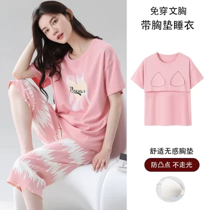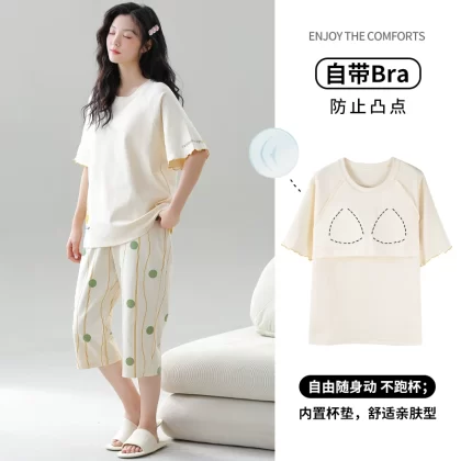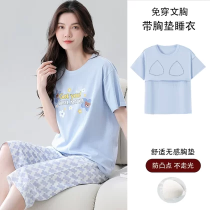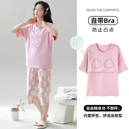 Women's all-in-one cropped trousers, half-sleeved cotton pajamas with breast pads