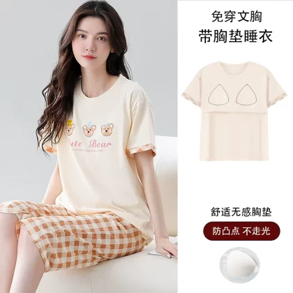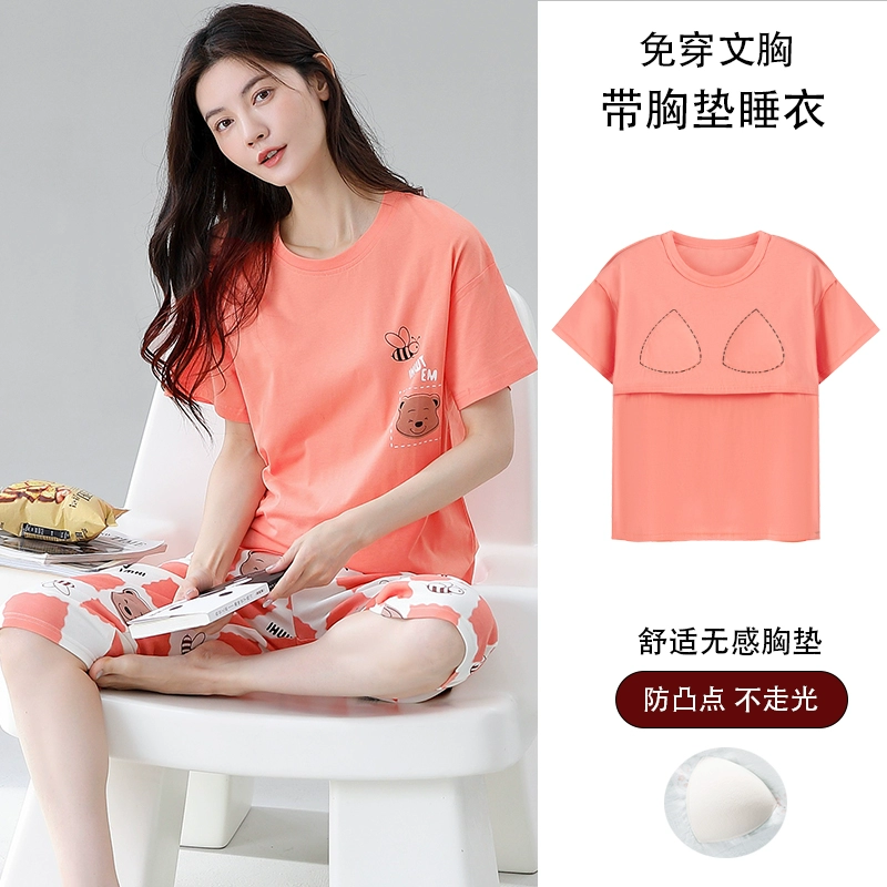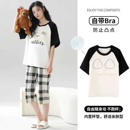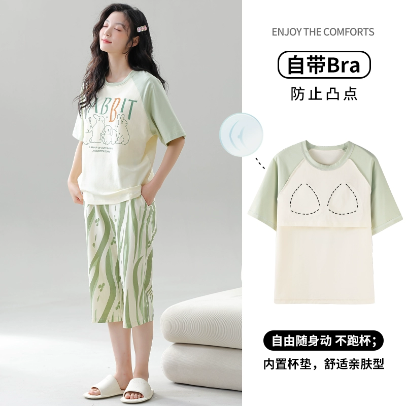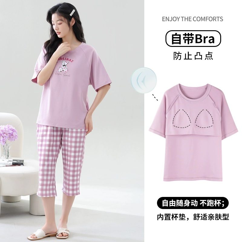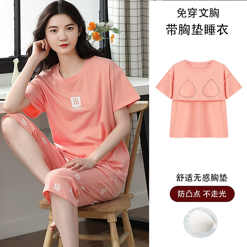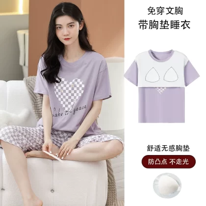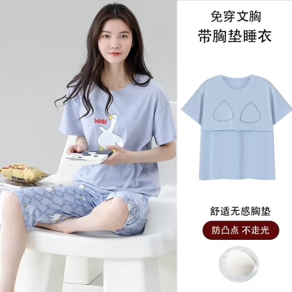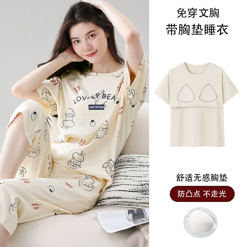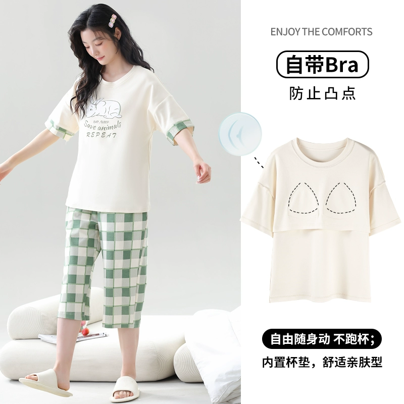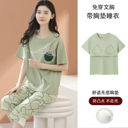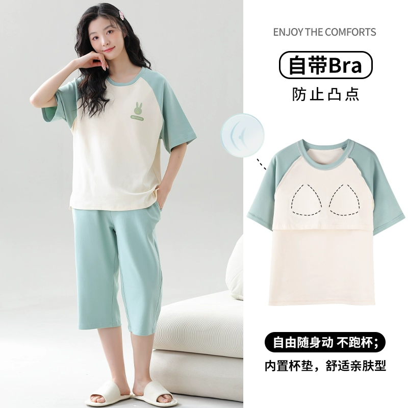 Women's all-in-one cropped trousers, half-sleeved cotton pajamas with breast pads