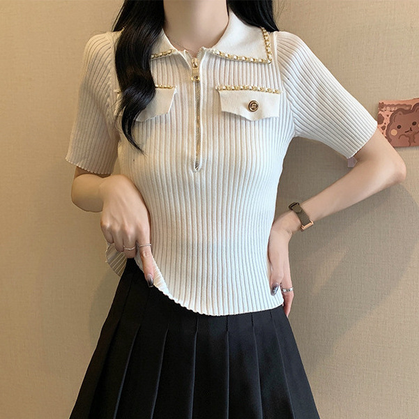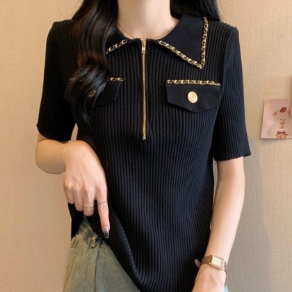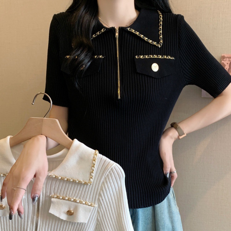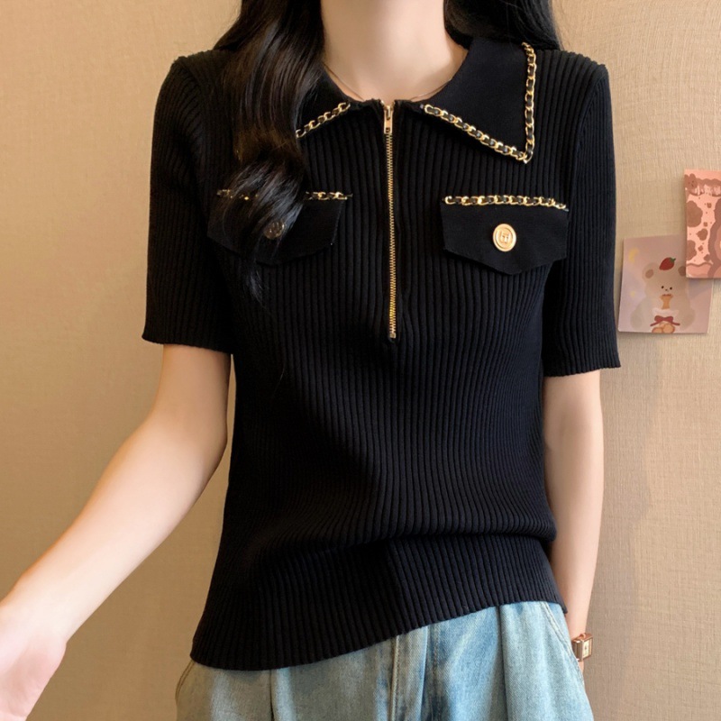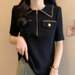Women's Clothing Real Shot 2024 Summer New Laps Small Chanel Style Knitted Shirt Fashionable Short Sleeve Women's Thin Ice Silk T-shirt