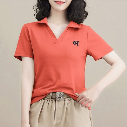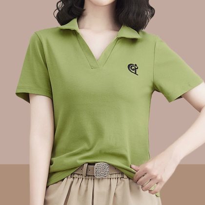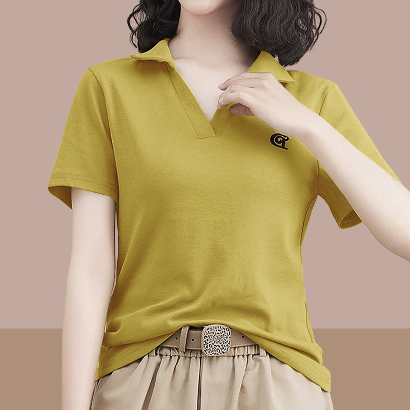 | nameOriginal | Women's cotton short-sleeved T-shirt 2024 Summer new T-shirt popular V-neck slim fit slimming versatile polo lapel top |