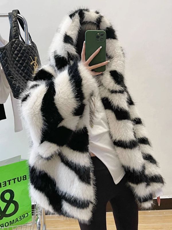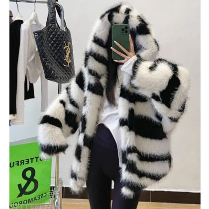 | nameOriginal | Women's fur coat zebra pattern hooded faux fox fur coat young Korean style thick winter warm jacket |