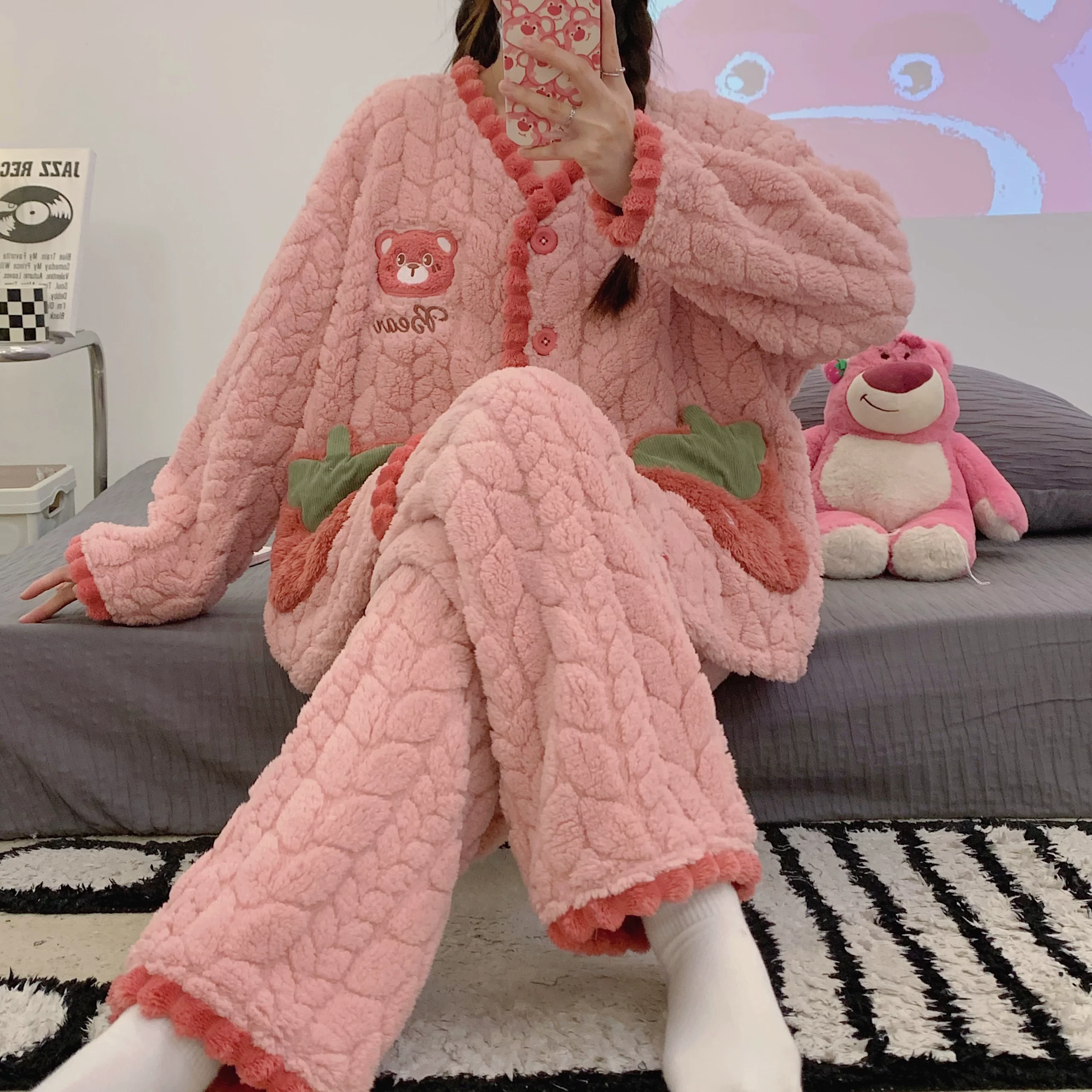 | nameOriginal | Women's pajamas autumn and winter flannel plus velvet thickened warm coral velvet winter cartoon cute home wear set |