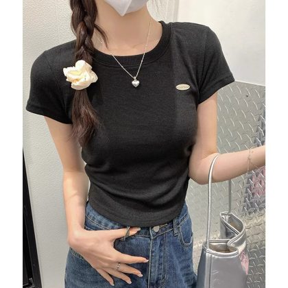 | nameOriginal | Women's short-sleeved shirt with pleated waist and tight waist, summer round neck, shoulder, small flying sleeve, short bottoming shirt T-shirt |
