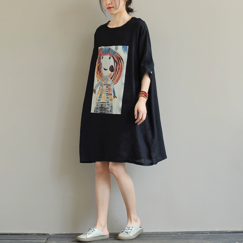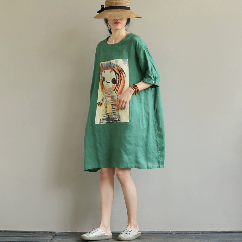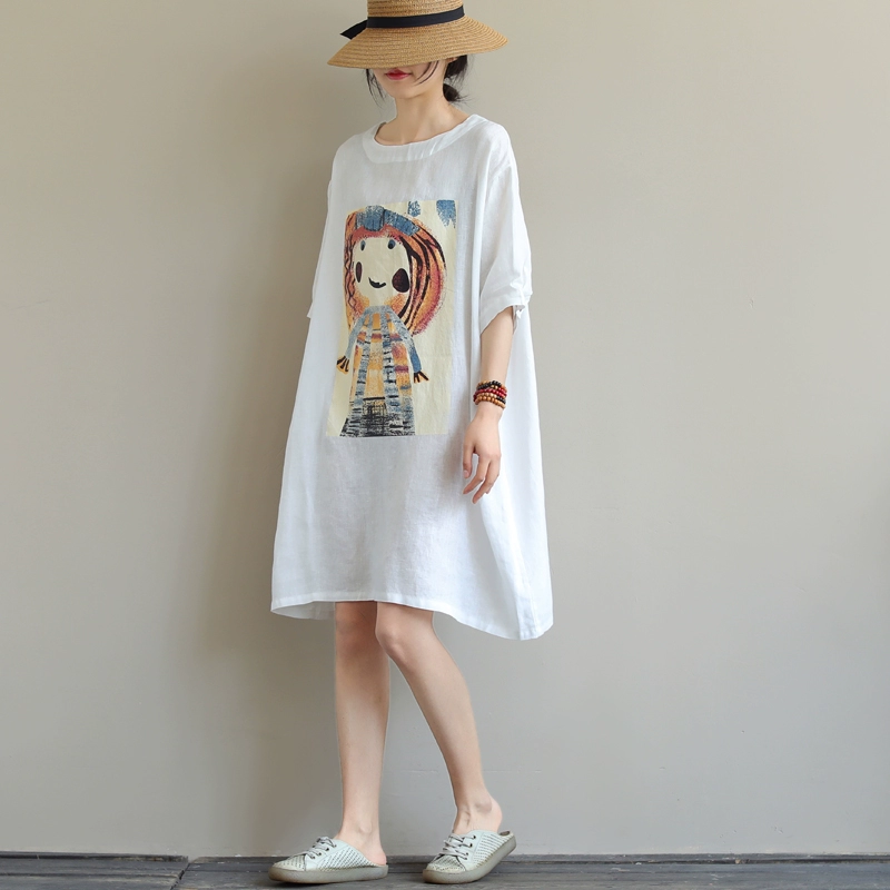 Women's summer age-reducing printed linen t-shirt dress cartoon