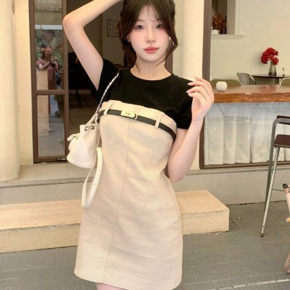 Women's summer French fat girl contrasting color short-sleeved dress