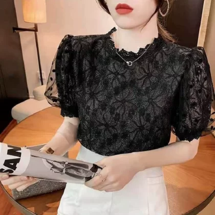 بلوزة نسائية صيفية فضفاضة بأكمام قصيرة من الدانتيل المجوف
