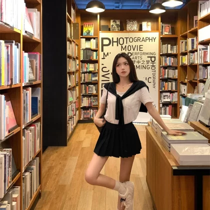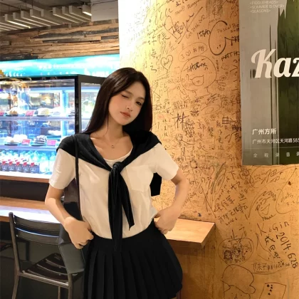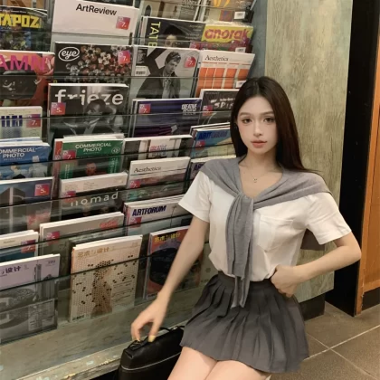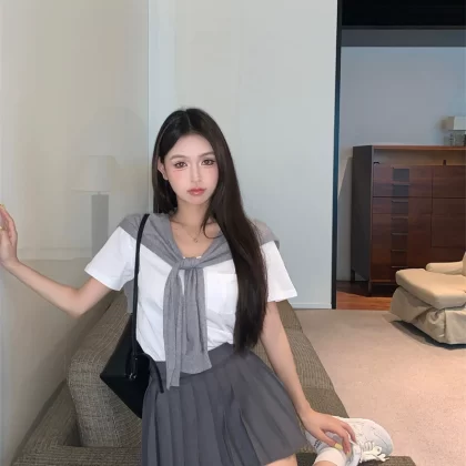 Women's summer white pleated skirt with shawl and short sleeves