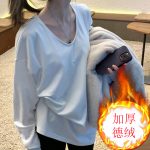 قميص نسائي سميك داخلي برقبة على شكل حرف v مخملي قاع قميص الخريف والشتاء تصميم شارع العليا بأكمام طويلة تي شيرت فضفاض كسول سبليت