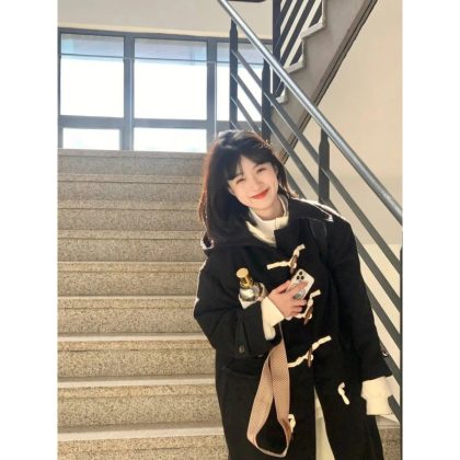 Women's woolen coat with horn buckle mid-length 2024 autumn and winter New Hepburn style small hooded woolen coat