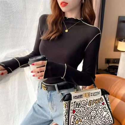 الأذن الخشبية على الوجهين قميص قاع دي مخملي نصف الياقة المدورة الدافئة كل مباراة نمط الخريف والشتاء ملابس داخلية جديدة ضئيلة