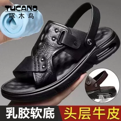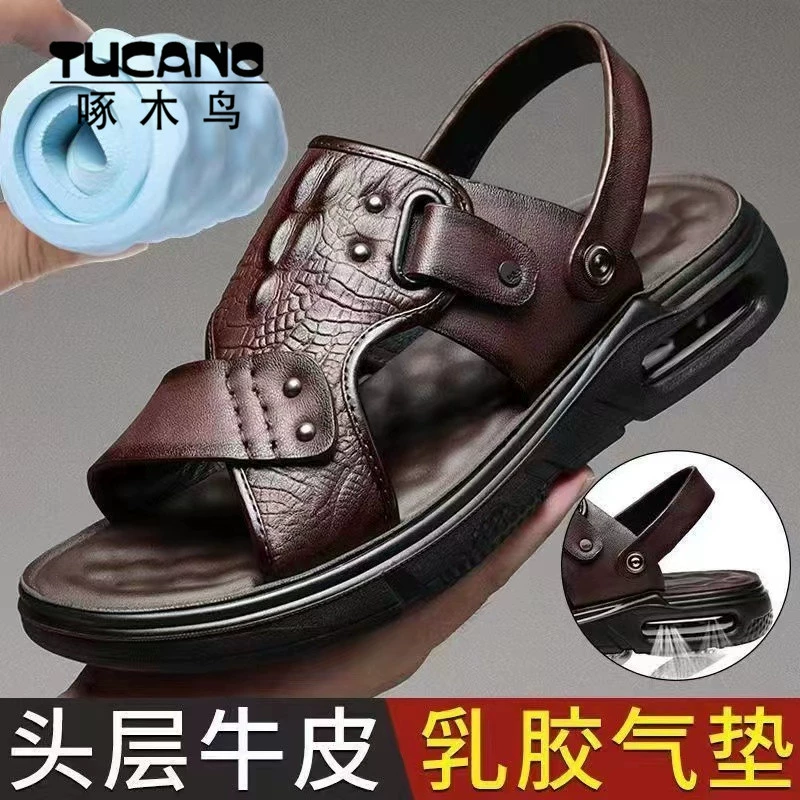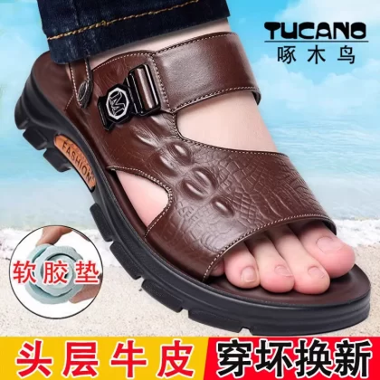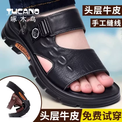 nameOriginal | Woodpecker Sandals Men's Summer 2023 New Trend Soft Soled Beach Shoes Men's Outerwear Crocodile Sandals Slippers Genuine Leather |