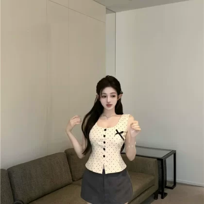 | nameOriginal | Xiaoxiang polka dot slim fit sleeveless off-white bow |