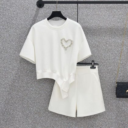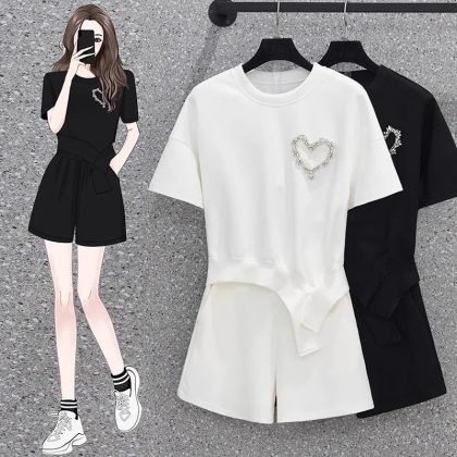 | nameOriginal | Xiaoxiang Style Casual Shorts suit Women's Summer 2023 Round Neck Sports Love Diamond-studded Student plus size Women's Clothing |