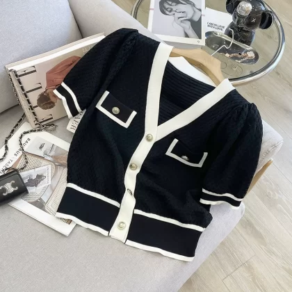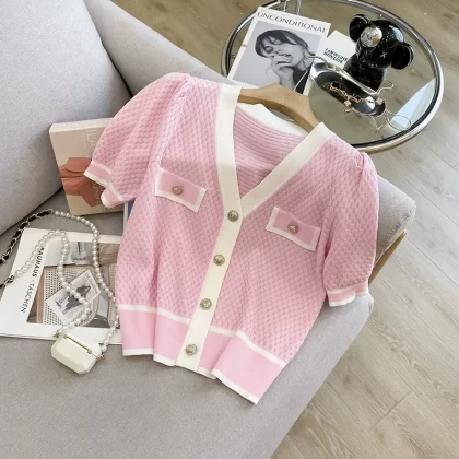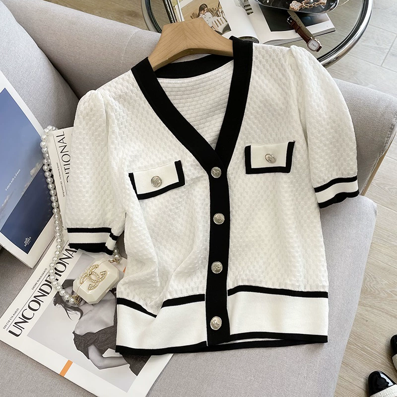 | nameOriginal | Xiaoxiangfeng contrast color V-neck ice silk top knitted cardigan |