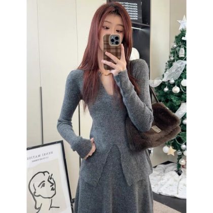 | nameOriginal | Xiaoyan v-neck split sweater Lazy suit winter skirt long skirt gentle style knitted two-piece suit |