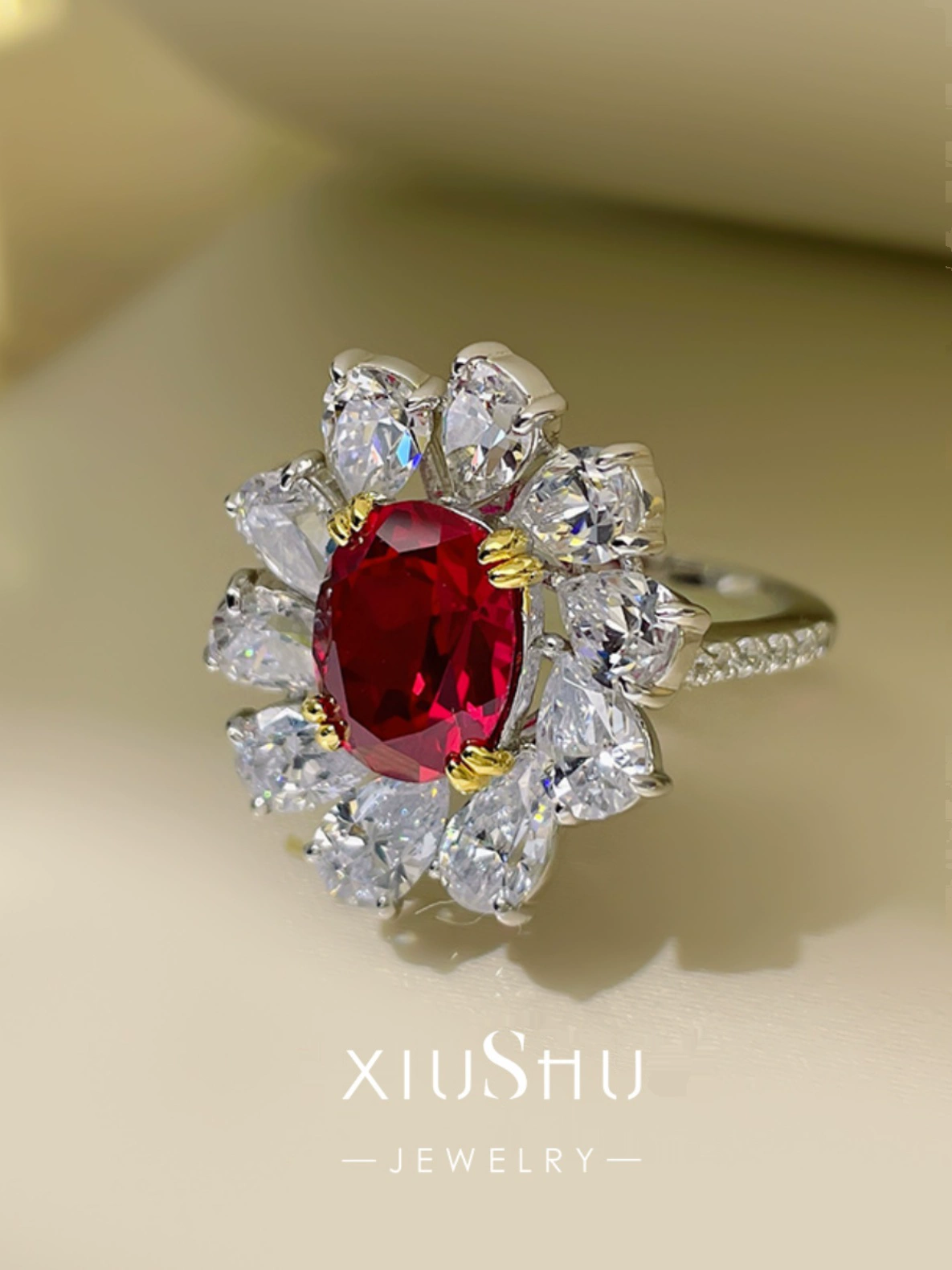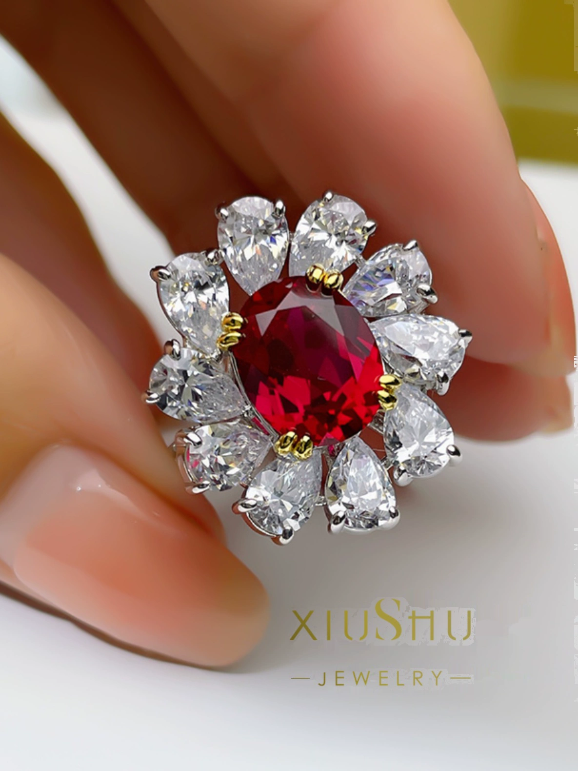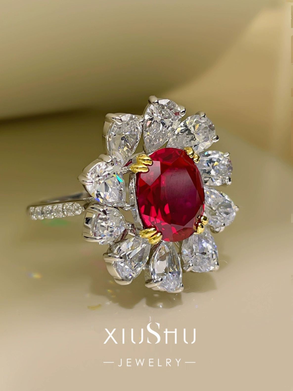 | nameOriginal | XIUSHU high-end 4 carat ruby artificial simulated pigeon blood red ring sterling silver flower high carbon diamond 061 |