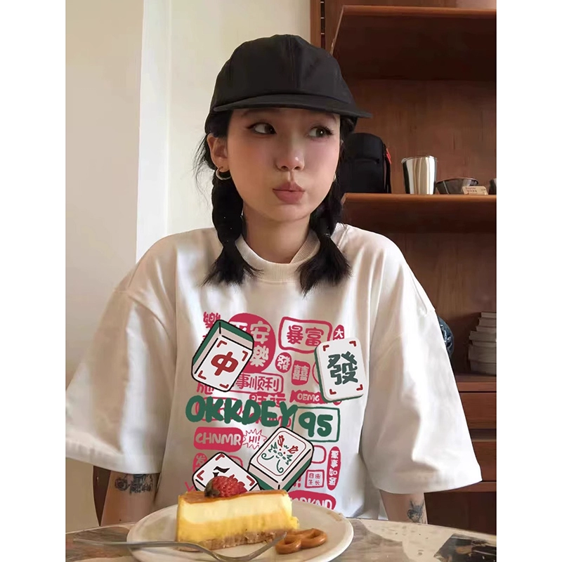 | nameOriginal | Year of the Dragon pure cotton short-sleeved T-shirt for women 2024 spring and summer new creative mahjong text printed clothes |