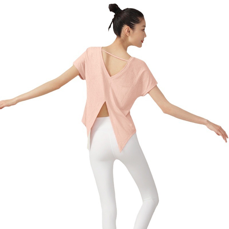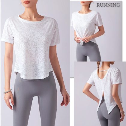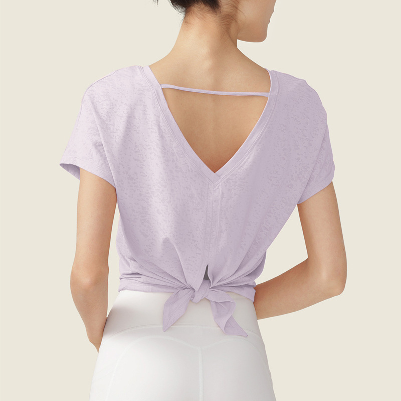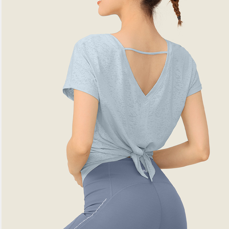 ملابس اليوغا المرأة الجديدة خفيفة الوزن الجاكار قصيرة الأكمام تي شيرت تنفس الجاكار تنفيس حزام مطاطا اللياقة البدنية 2023