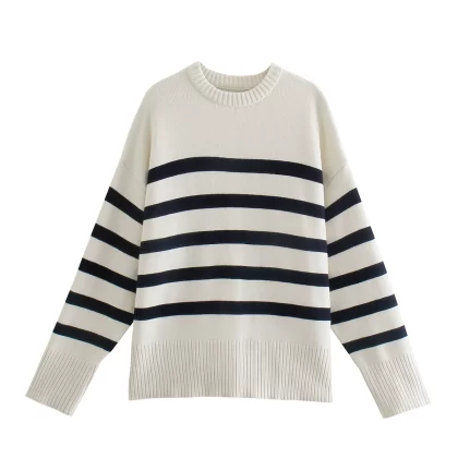 “YUXI” ZAR الملابس الأوروبية والأمريكية الفرنسية الرجعية فضفاضة نمط كسول سترة مخططة بأكمام طويلة ورقبة مستديرة