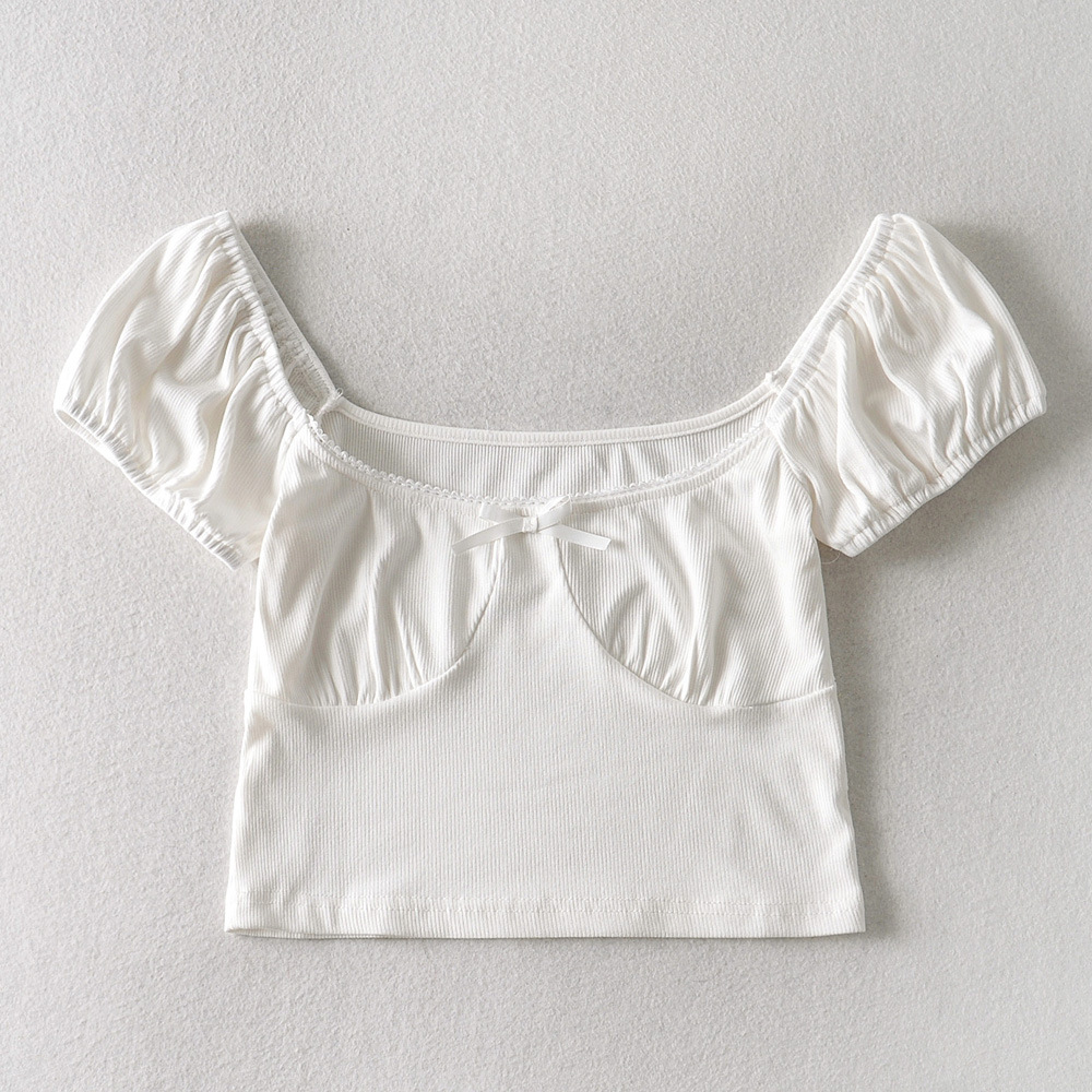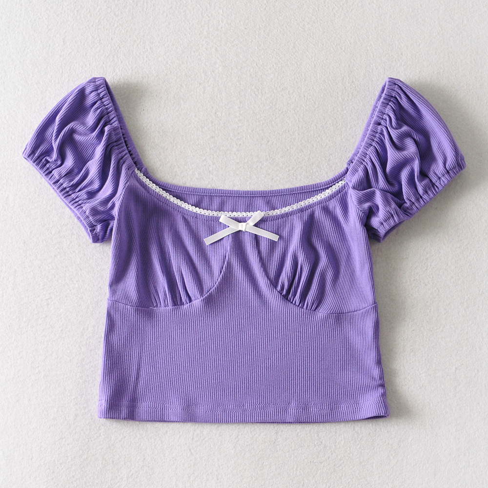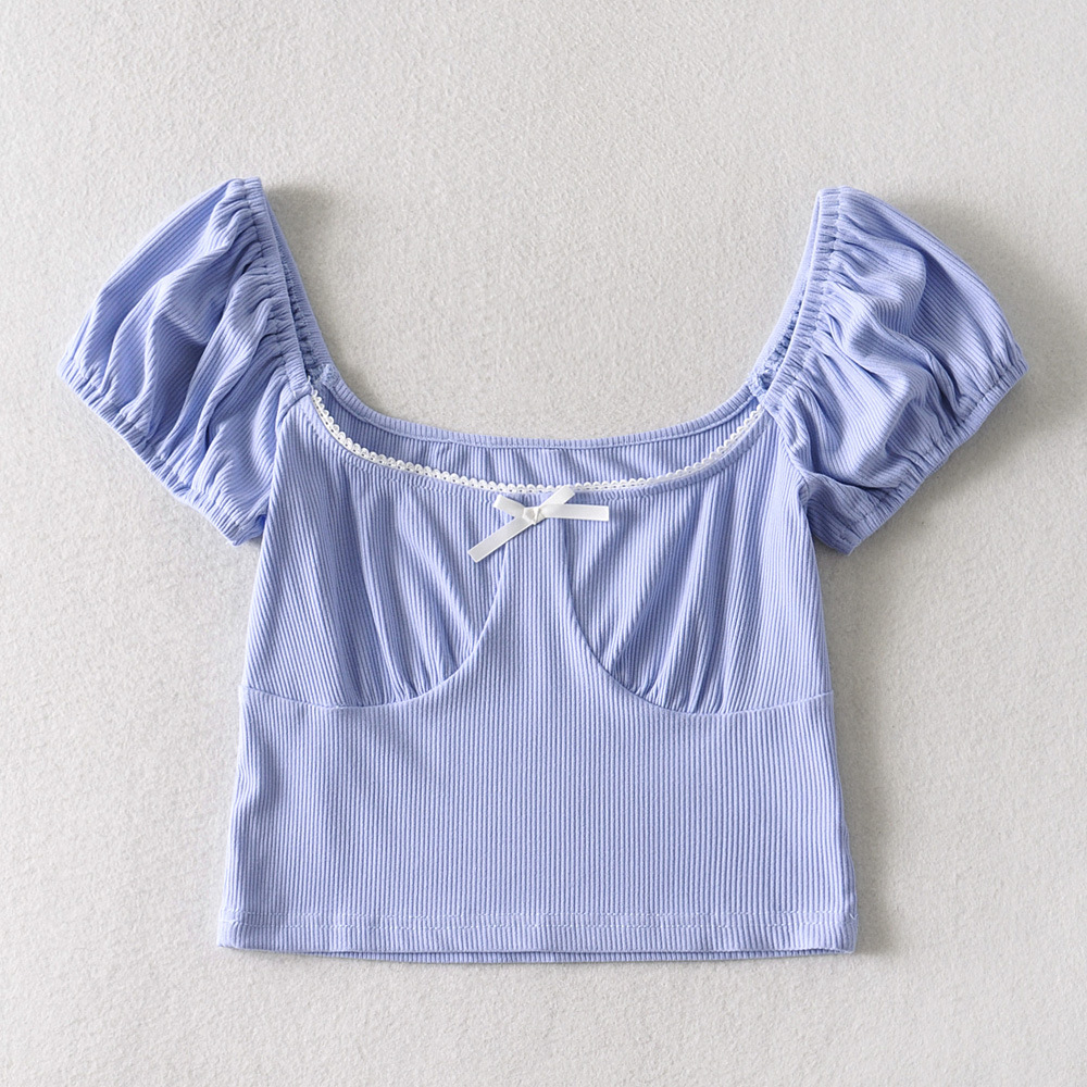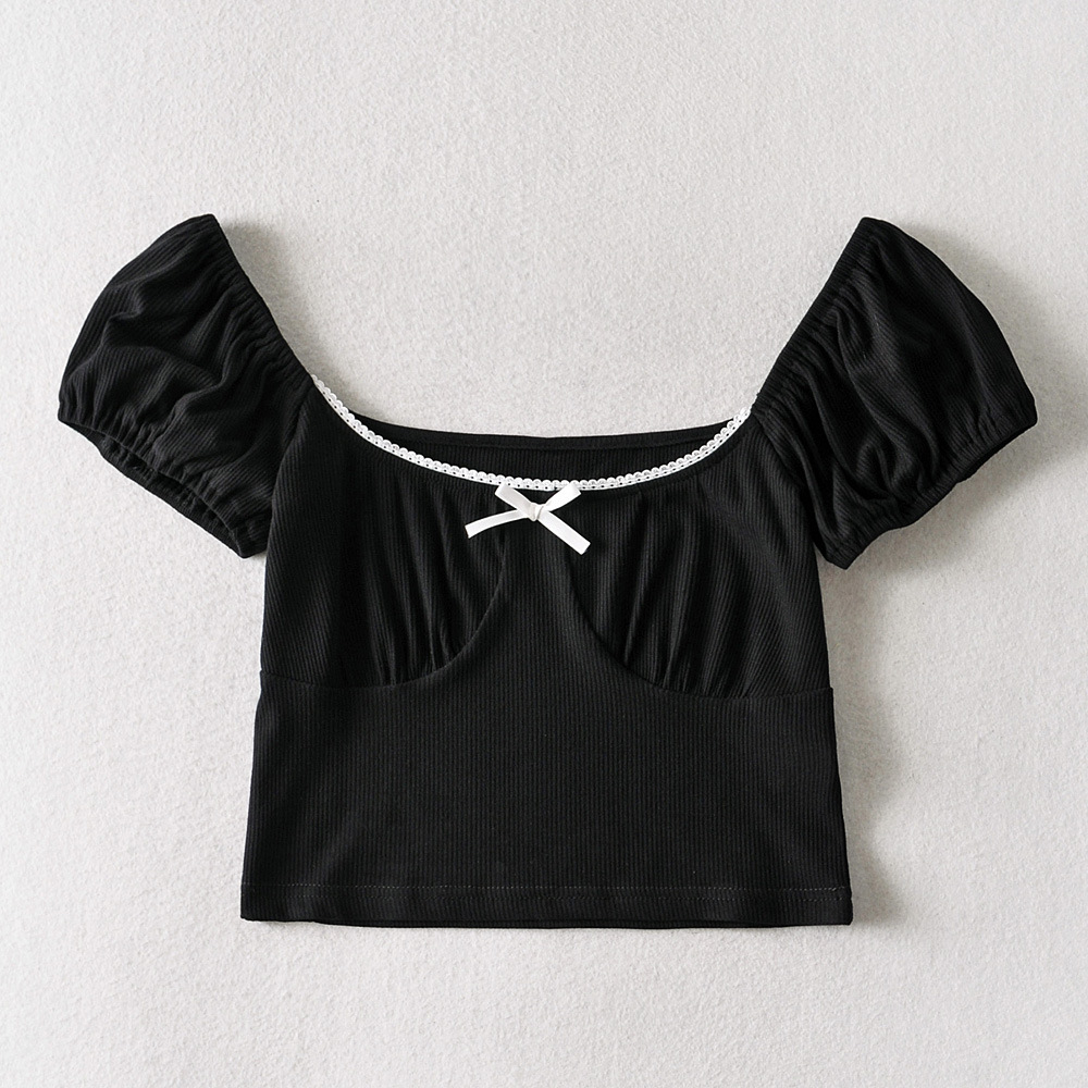 | nameOriginal | Z2031-21 Korean Style Slim Fit Square Collar Lace Stitching Chest Bow Thread Navel Open Short Sleeve T-shirt |