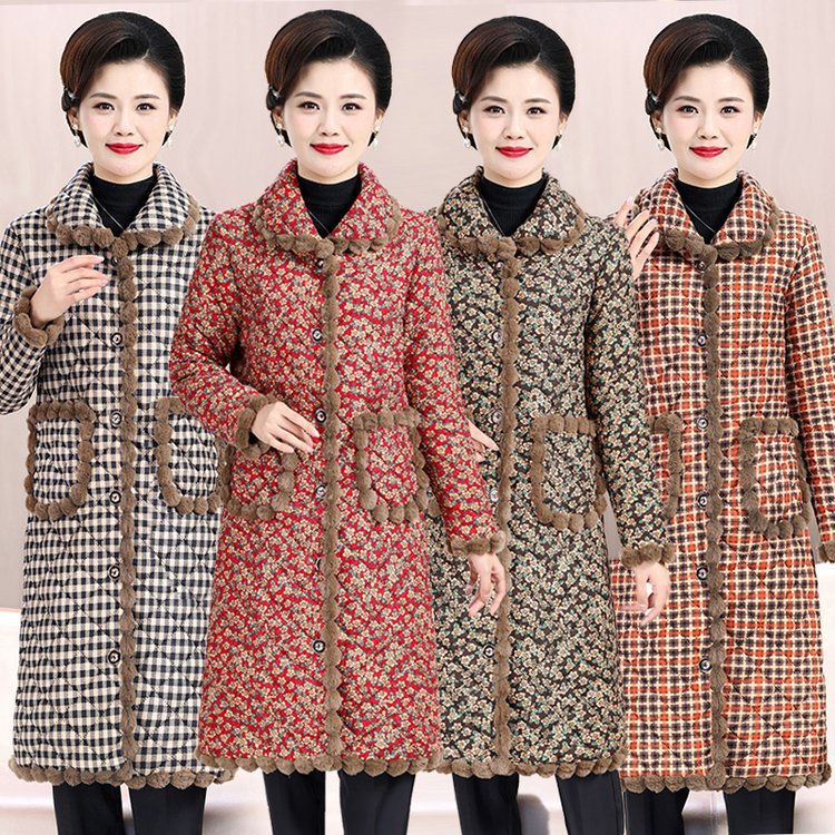 Mom’s winter clothes thickened mid-length cotton-padded coat middle-aged and elderly women’s fleece-lined warm cotton-padded coat stand collar flower cotton-padded jacket