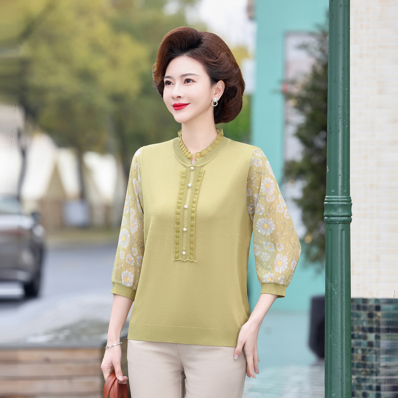 Middle-aged Mother’s Spring Dress Fashionable Loose Base Shirt Middle-aged and Elderly Spring and Summer Gauze Sleeve Knitted Top Thin Shirt Small Shirt