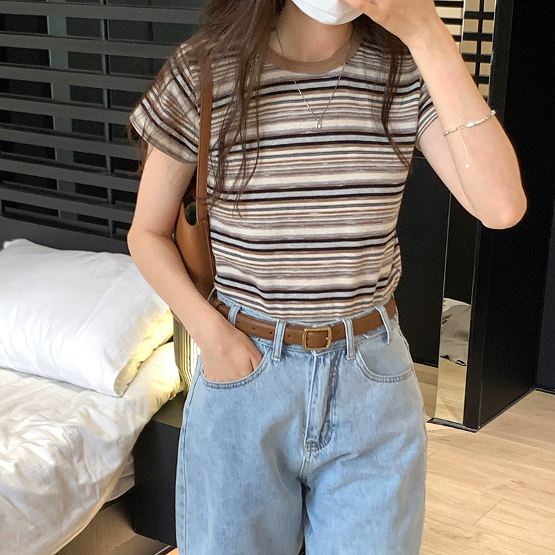 Simple Japanese spliced ​​striped bottoming round neck short-sleeved T-shirt for women 2024 summer loose casual chic inner top