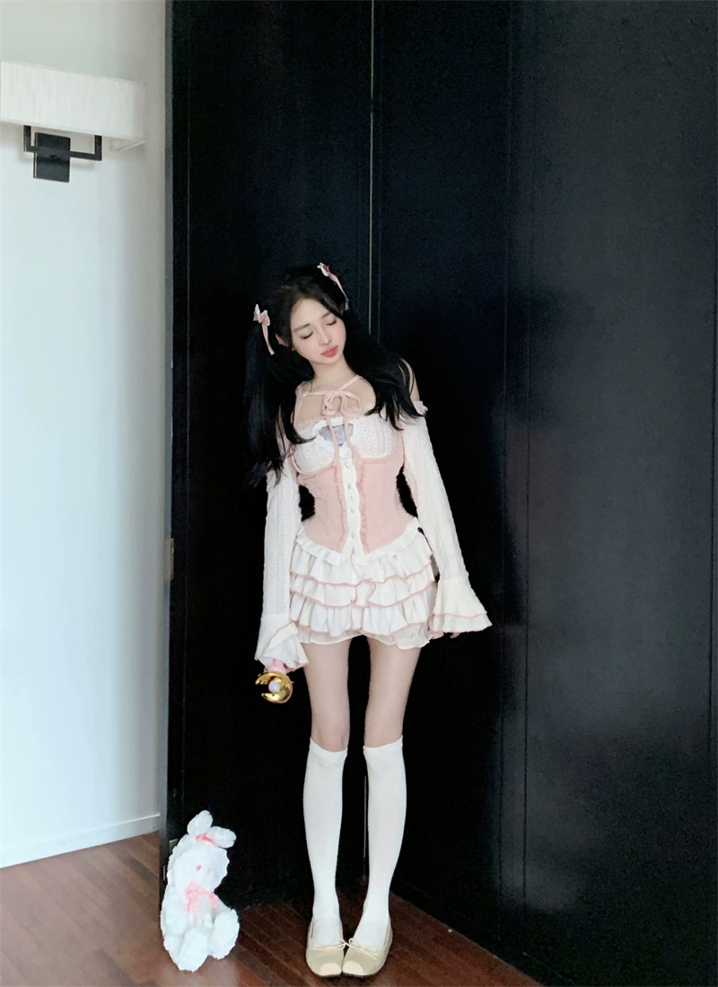 Sweet and Spicy Girl Suit Skirt Women’s Summer Sexy One-shoulder Top Knitted Vest Cake Skirt Three-piece Set