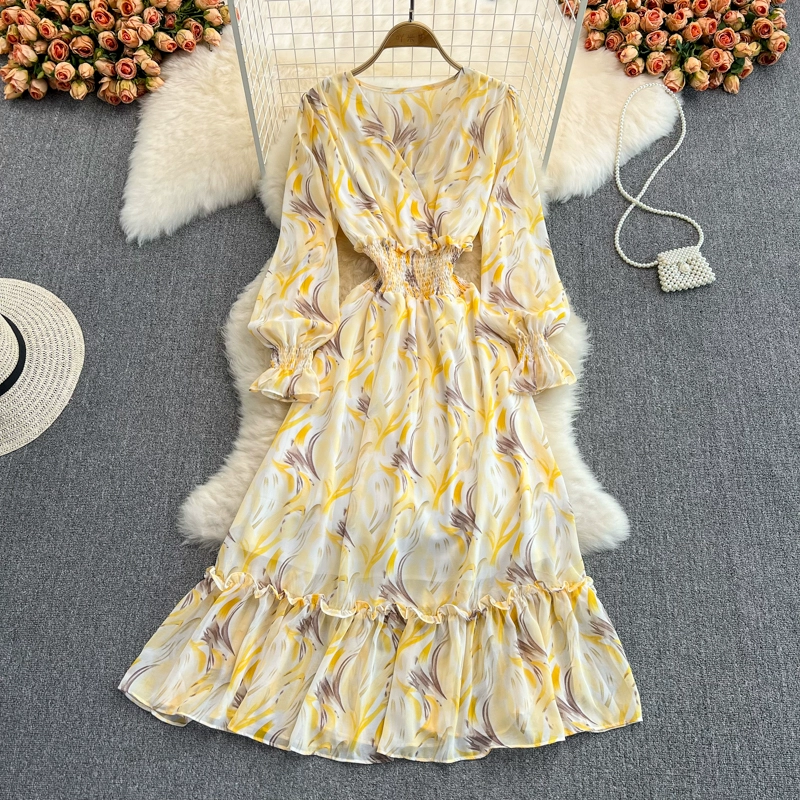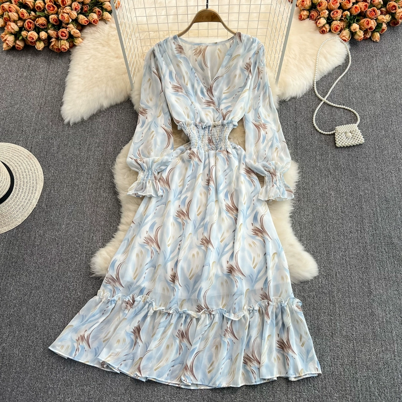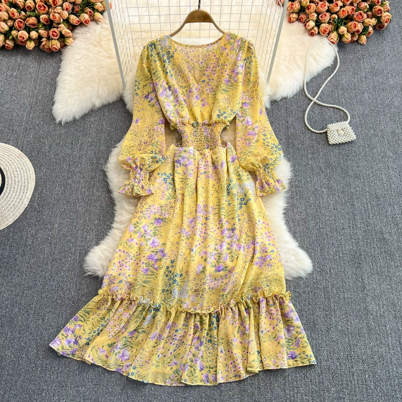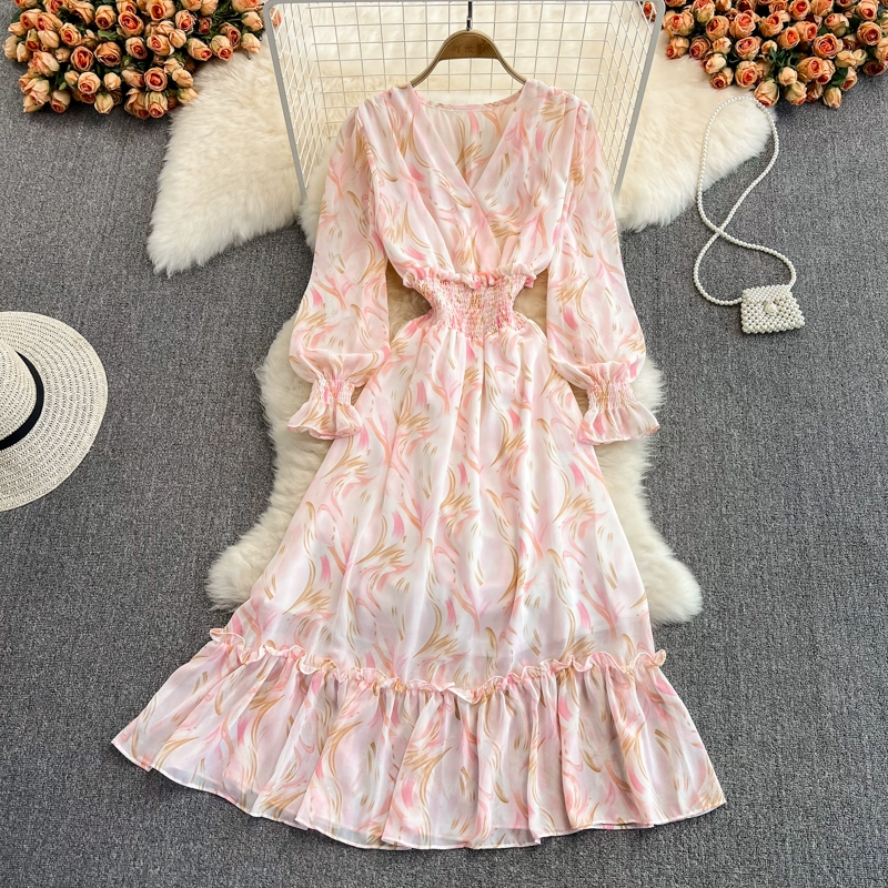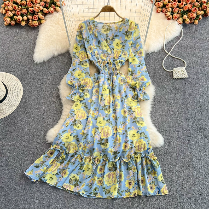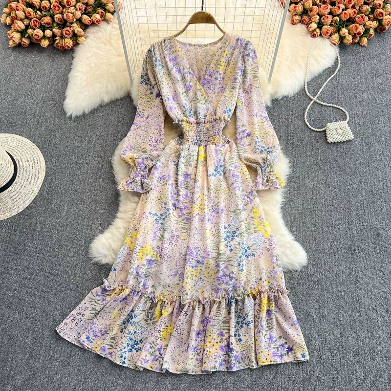 | nameOriginal | Spring and Autumn French retro gentle style high-waisted slim V-neck floral chiffon dress with elegant temperament and long skirt |