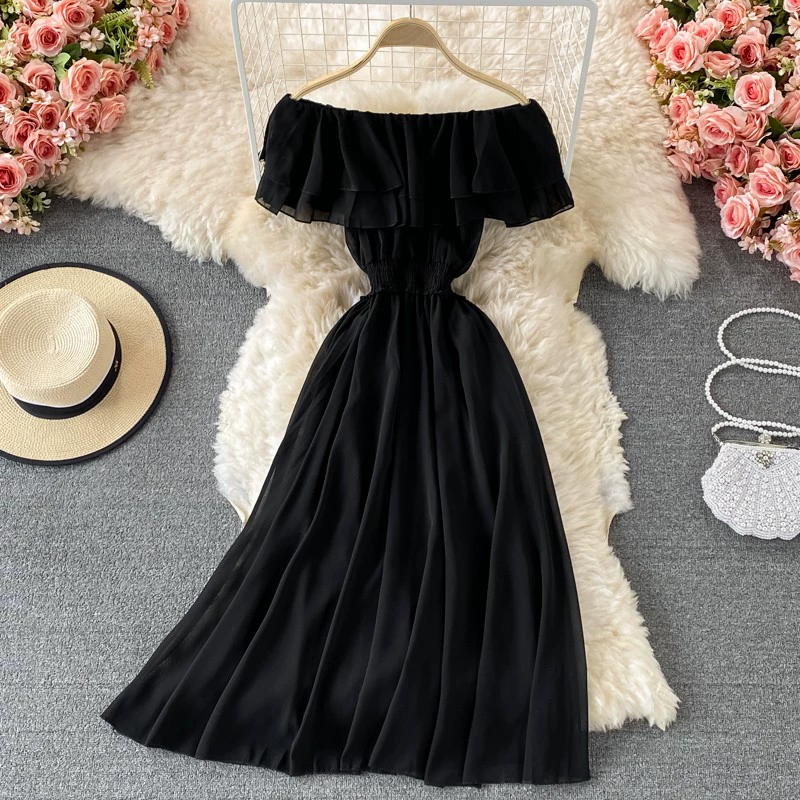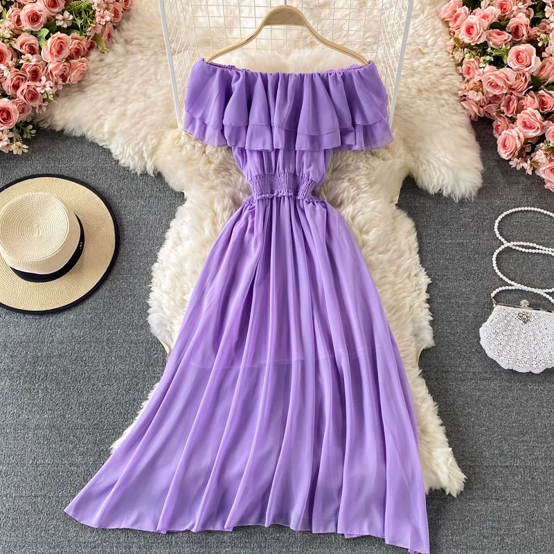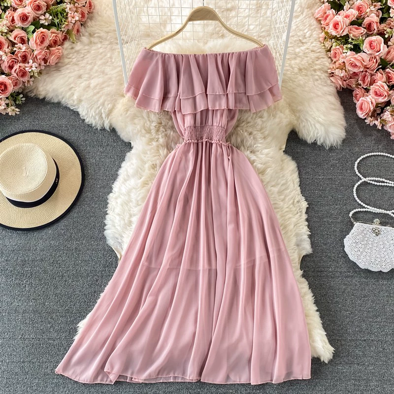 | nameOriginal | Bali vacation seaside beach slimming long skirt sexy off-shoulder one-shoulder ruffled chiffon dress |
